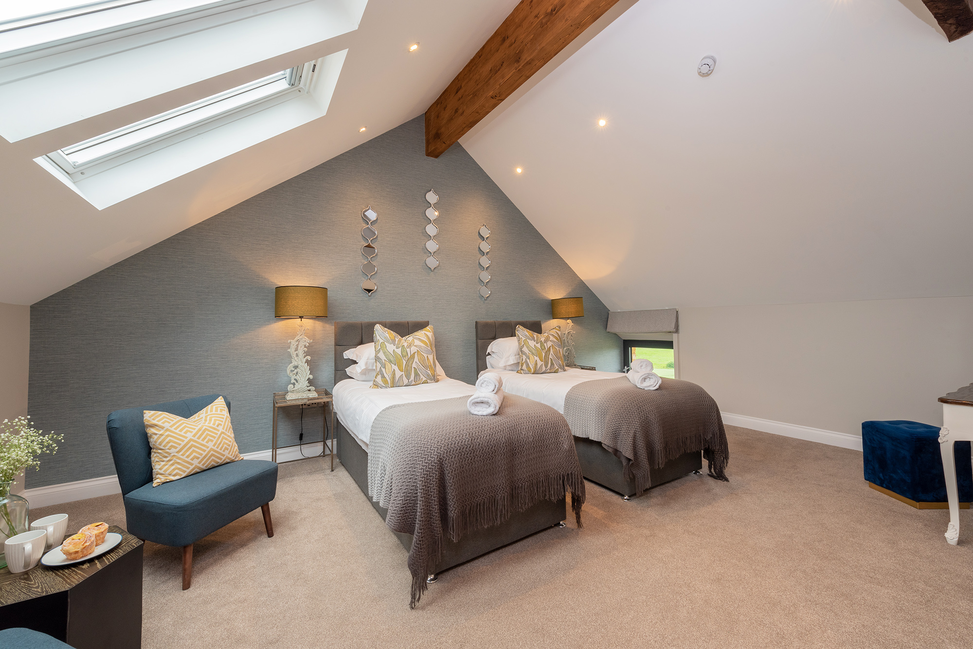 Bedroom 12 is on the second floor and has zip and link beds that can be arranged as a super king or twins. This room also has the option of an additional single bed and/or a Hypnos double sofa bed so can sleep up to 5 guests; both of these are available at an extra charge. There is an en suite bathroom with a free standing bath and walk-in shower.